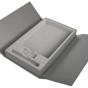 Коробка из переплетного картона, кашированного дизайнерской бумагой Malmero, с флокированным ложементом.